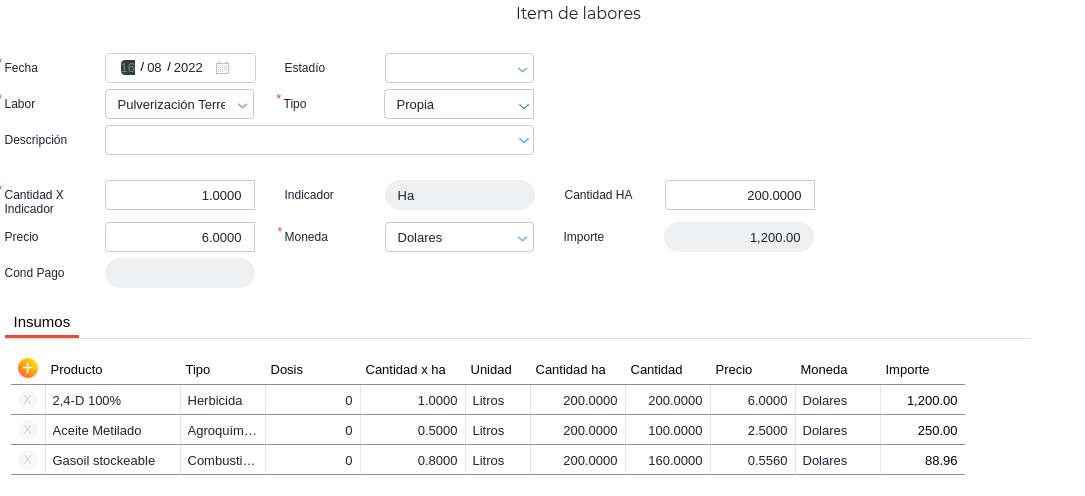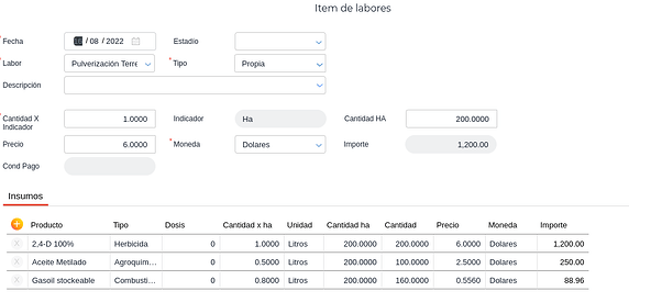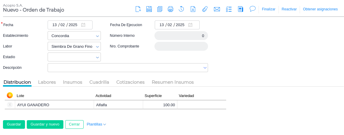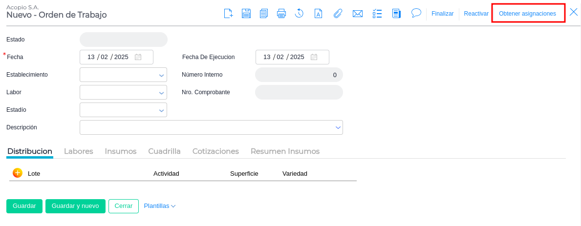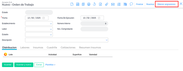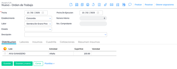 Para acceder a esta funcionalidad se accede desde cualquier transacción de Gestión Agrícola. En este caso se ejemplifica con una Orden de Trabajo. La misma es factible de utilizar desde laboreos agrícolas.