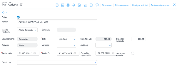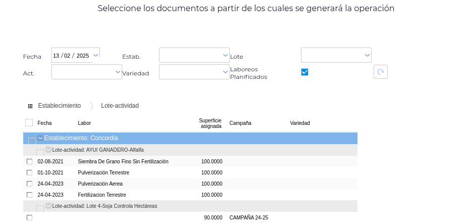 En las transacciones de Gestión Agrícola, se agregó una funcionalidad al botón “Obtener Asignaciones” que consiste en un tilde llamado “Laboreos Planificados”. El mismo, hace que se despliegue una lista de Laboreos agrupados por “Establecimiento” - “Lote - Actividad” que fueran previamente cargados en el plan agrícola. Con el objetivo de optimizar el uso del tiempo destinado a la planificación y su reutilización en la gestión agrícola.