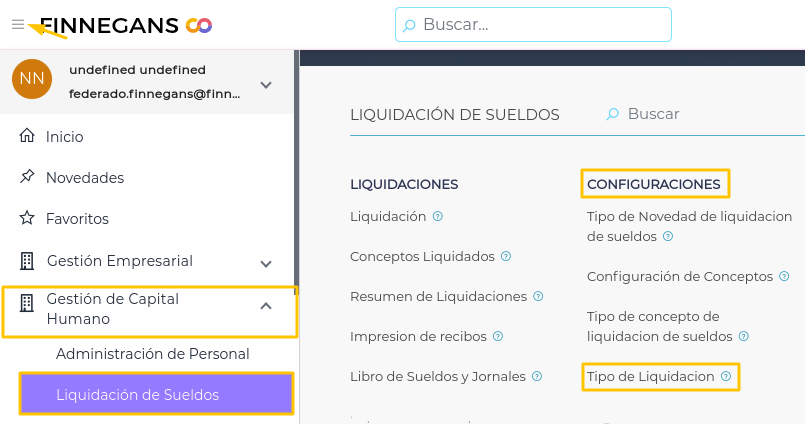 Menú → Gestión de Capital Humano → Liquidación de Sueldos → Configuraciones → Tipo de liquidación.