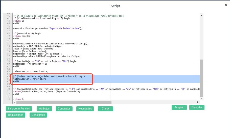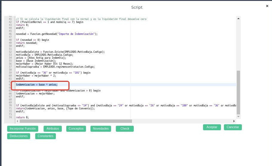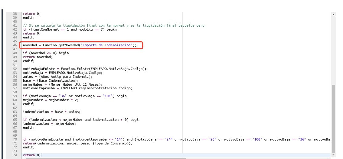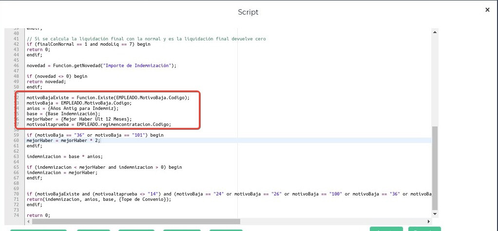 La fórmula en la línea 59 redefinirá la variable “mejorHaber” en caso de que cumpla con alguno de los siguientes dos requisitos. Si el motivo de baja que se haya cargado al trabajador corresponde al 36 (MB Desp. S/Causa Trab.Agrario C/Preaviso) o 101 (MB Desp. S/Causa Trab.Agrario S/Preaviso) La variable “mejorHaber” pasará multiplicarse por 2. Si el motivo de baja fue cargado con otro código, la variable “mejorHaber” no sufrirá ningún cambio.