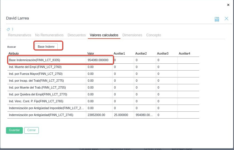 Para saber que base tomo efectivamente, debemos buscar en la liquidación ambas variables y verificar que importe es mayor. Para buscar la variable indemnización debemos buscar en la solapa de valores calculados el concepto “Base Indemnización”.
