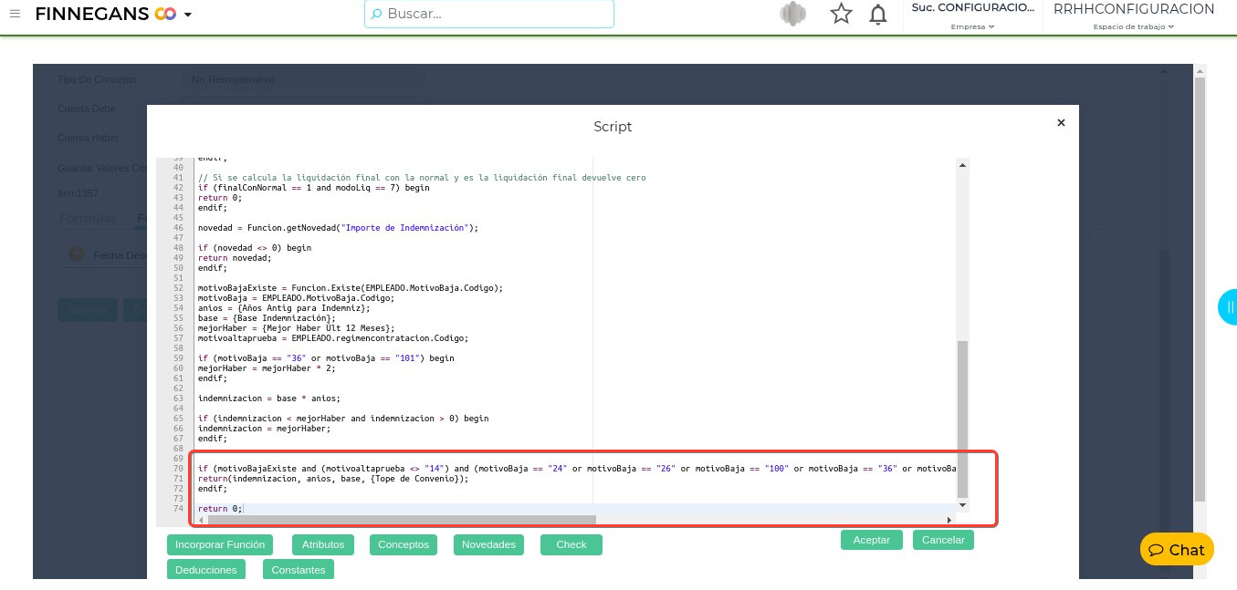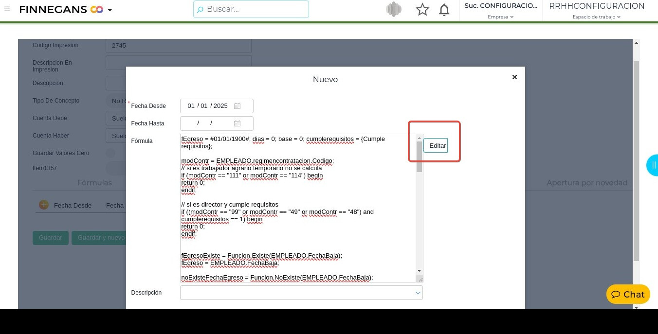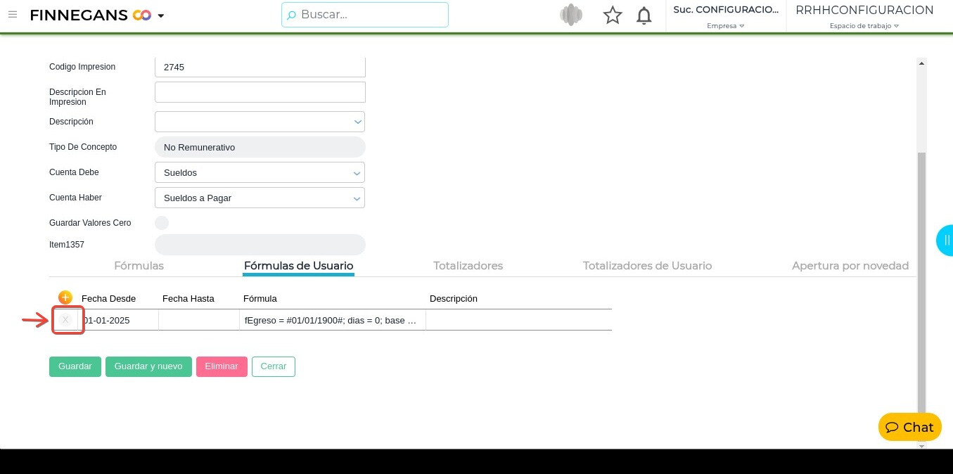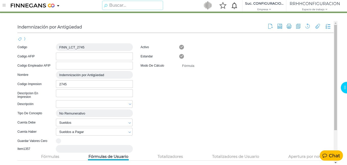 - Dirigirse a → Gestión del talento humano → Liquidación de sueldos → Configuraciones → Configuración de conceptos → Buscar el concepto “FINN_LCT_2745”.