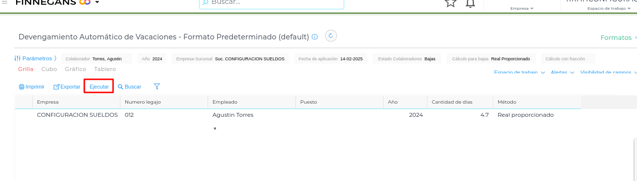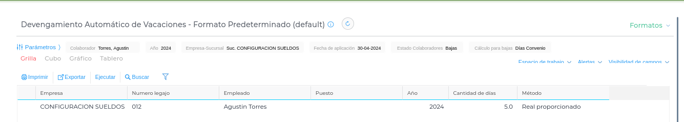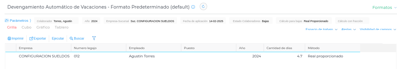 5- En el ejemplo adjunto la proporción de días es mayor a 4.5 por lo que el sistema redondea para arriba emitiendo 5 días de vacaciones para el colaborador.