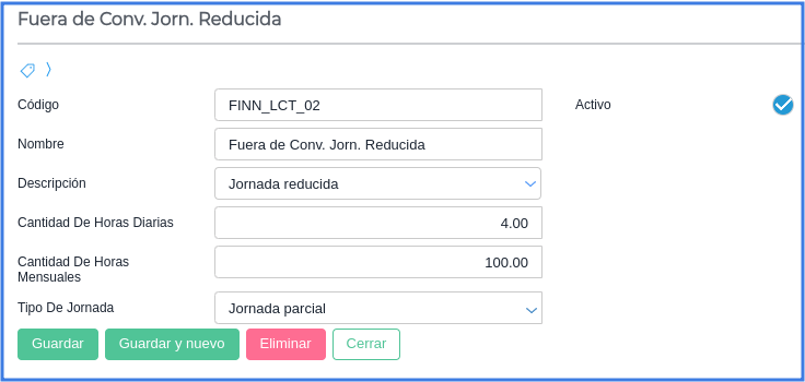 Cantidad de horas diarias: En este campo vamos a indicar las 4hs diarias que, en este caso, presta servicios el colaborador por jornada.