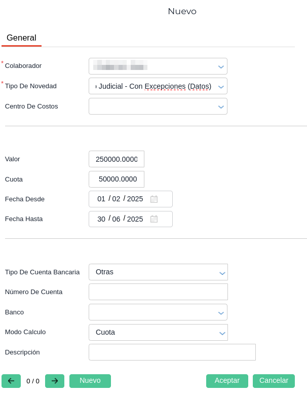 Cuota: Este campo puede completarse de dos maneras, con el valor de la cuota a descontar por mes que determine el oficio o puede dejarse en “0” si el documento dictamina que sea haga un descuento por un porcentaje que varia según el salario básico del colaborador.