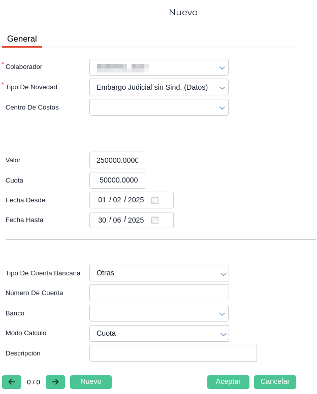 Cuota: Este campo puede completarse de dos maneras, con el valor de la cuota a descontar por mes que determine el oficio o puede dejarse en “0” si el documento dictamina que sea haga un descuento por un porcentaje que varia según el salario básico del colaborador.