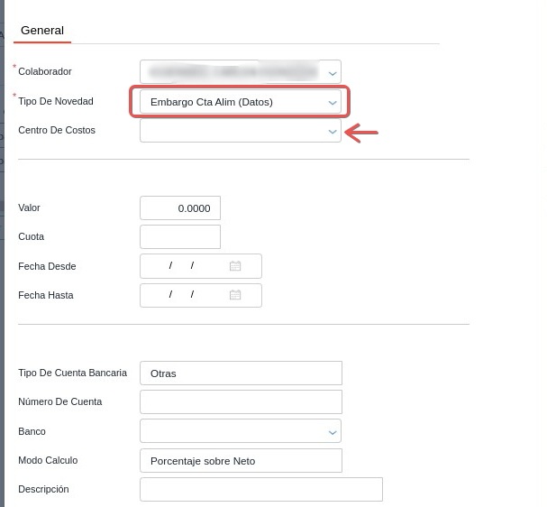 Completar el campo Tipo de Novedad con Embargo Cta Alim (Datos). El campo Centro de Costo no es un dato obligatorio.