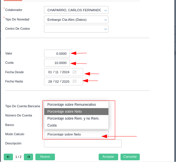 Modo Cálculo: Indicar el porcentaje y sobre que base se hará el descuento según lo dictamine el oficio judicial.