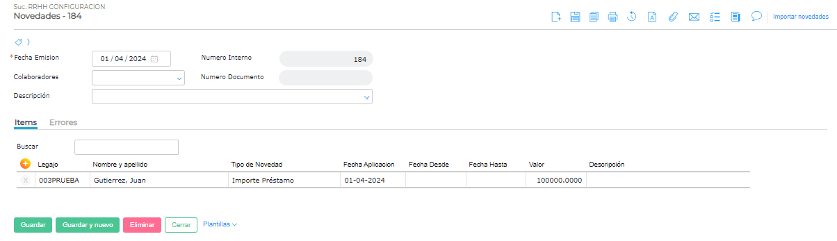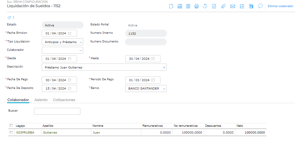 Importante: la carga del préstamo solo cumple la función de realizar automáticamente el descuento correspondiente en cada liquidación según lo configurado.