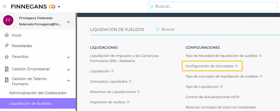 - Ingresar desde el menú → Gestión de Talento Humano → Liquidación de Sueldos → Configuraciones → Configuración de Conceptos.