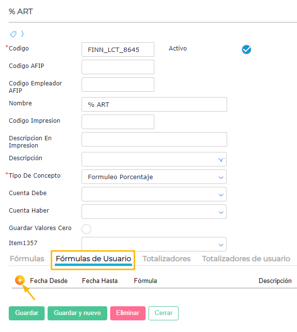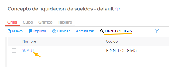 - Ingresar en el buscador de conceptos el nombre del concepto (% ART) o su código (FINN_LCT_8645) e ingresar al mismo: