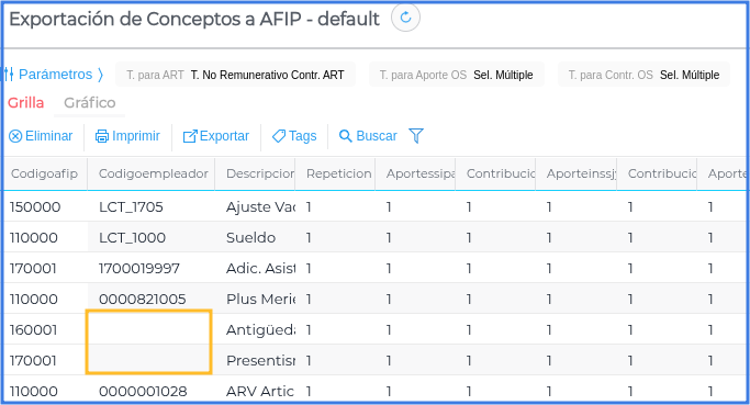 Si existen conceptos en el exportador que no posean Código AFIP o Código Empleador AFIP se deben configurar estos previos a la exportación.