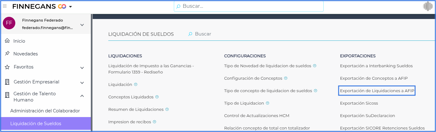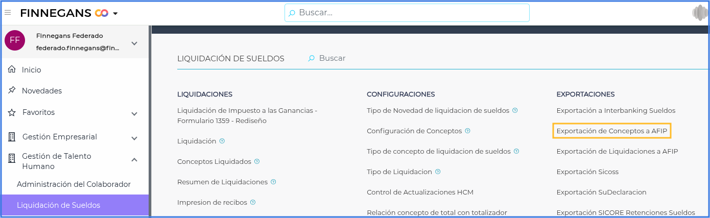 Ingresar al menú → Gestión de Talento Humano → Liquidación de Sueldos → Exportaciones → Exportación de Conceptos a AFIP.