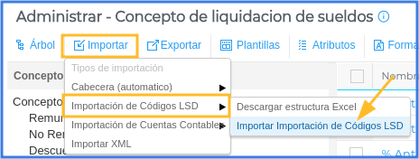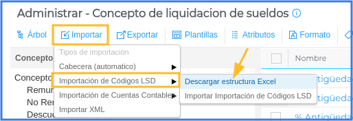 Seleccionar importar → Importación de Códigos LSD → Descargar estructura Excel.