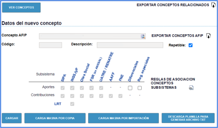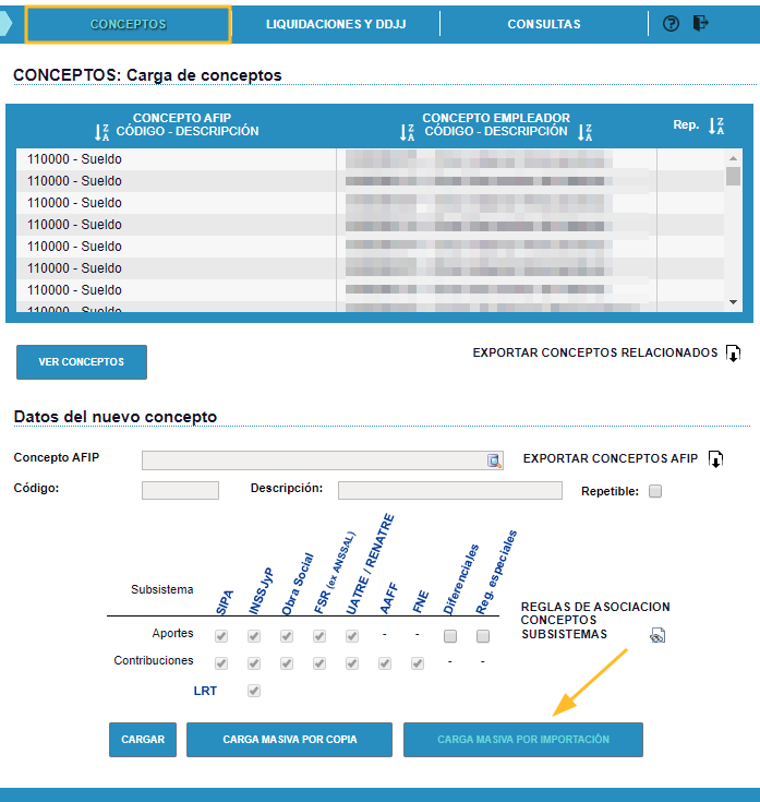 Importar el archivo en ARCA haciendo clic en Conceptos → Carga masiva por importación.