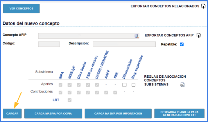 - Luego cliquear en cargar para dar de alta el concepto.