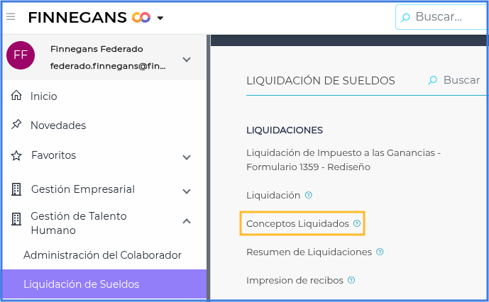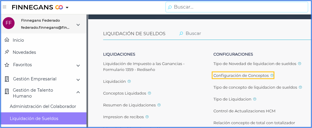 Ingresar al menú → Gestión de Capital Humano → Liquidación de Sueldos → Configuraciones → Configuración de Conceptos.