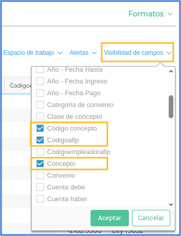 Quitar la visibilidad de todos los campos, exceptuando por Código de concepto, nombre de concepto, tipo de concepto y código AFIP.