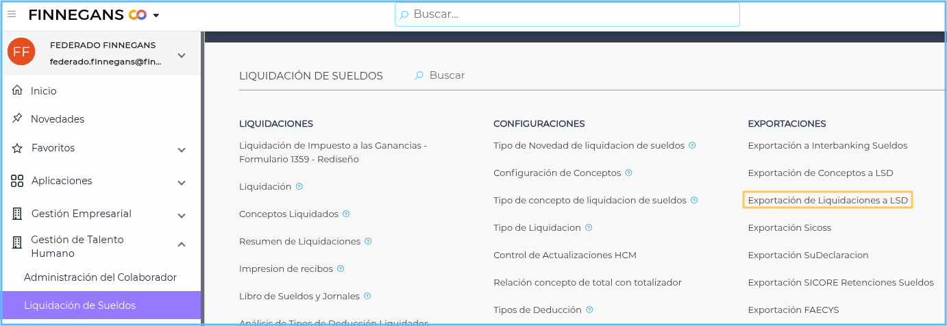 Ingresar al menú → Gestión de Talento Humano → Liquidación de Sueldos → Exportaciones → Exportación de Liquidaciones a LSD.