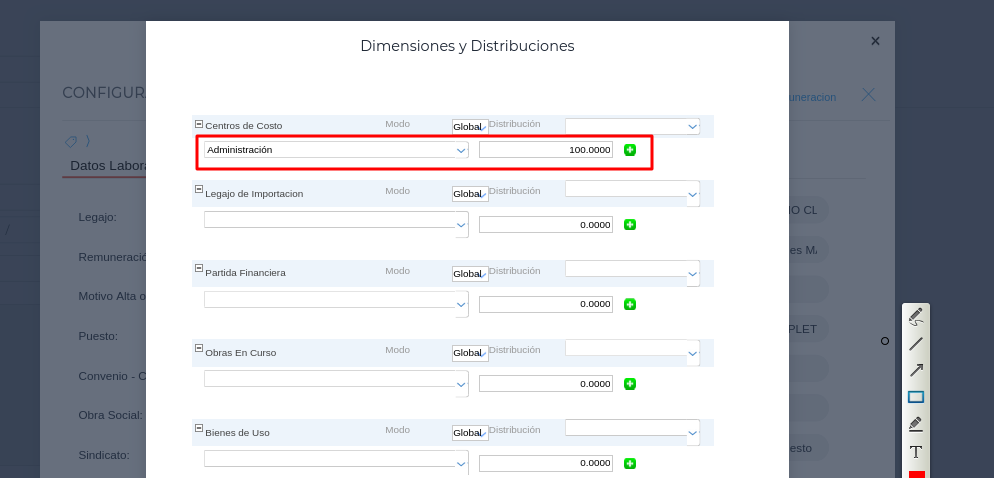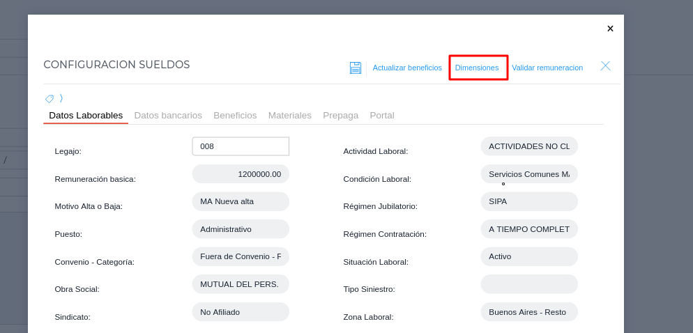 A. Ingresar el centro de costo dentro del legajo del colaborador. Para esto hay que dirigirse al legajo del colaborador→ Ingresar a la solapa “Dimensiones”.