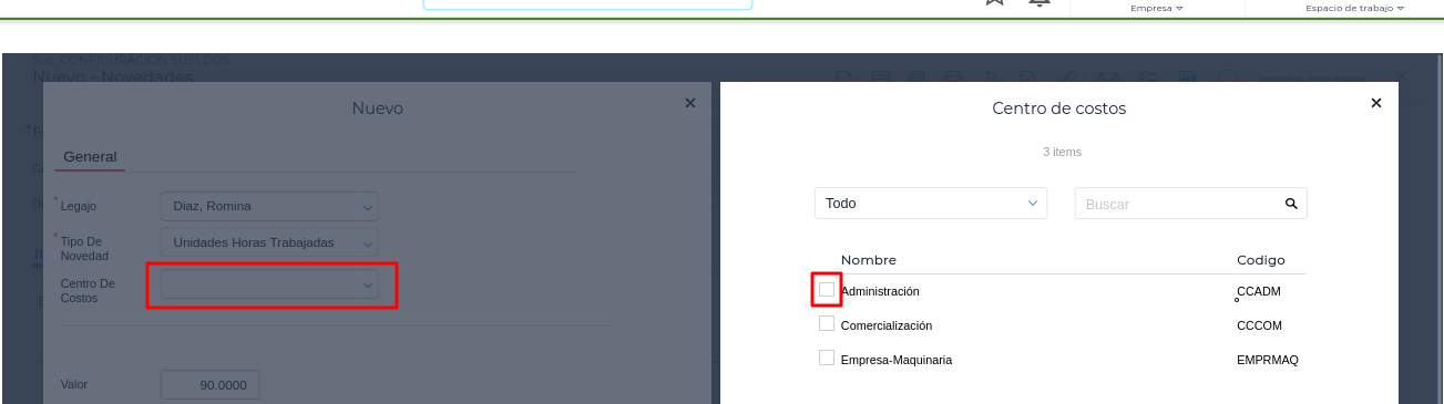 Si se optara por la opción de cargar el centro de costo dentro de las novedades, debe tenerse en cuenta que solo podemos cargar dicha información en novedades correspondientes a “Unidades”, Ejemplos: Unidades Horas Trabajadas, Unidades Horas Nocturnas, Horas Lluvia, Etc. No se puede mezclar novedades de unidades con novedades por importe, ya que esto generara un error a la hora de generar el asiento contable.