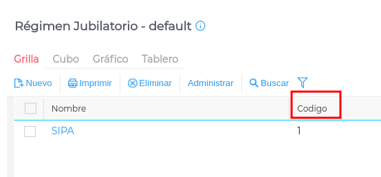 - Una vez allí, se podrán visualizar el régimen jubilatorio, mostrando el nombre en la primer columna y luego el código, este último es el que vamos a cargar en la planilla de Carga de Empleados, en la columna RegimenJubilatorioID_Codigo