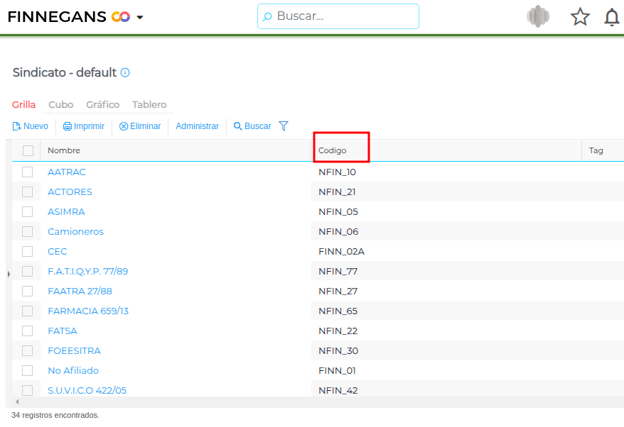 - Una vez allí, se podrán visualizar todos los sindicatos, mostrando el nombre en la primer columna y luego el código, este último es el que vamos a cargar en la planilla de Carga de Empleados, en la columna SindicatoID_Codigo.