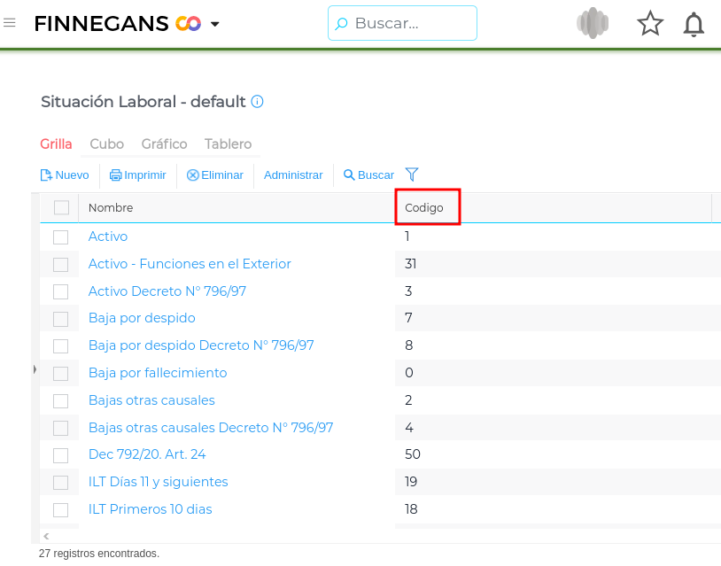 - Una vez allí, se podrán visualizar las situaciones laborales, mostrando el nombre en la primer columna y luego el código, este último es el que vamos a cargar en la planilla de Carga de Empleados, en la columna SituacionLaboralID_Codigo