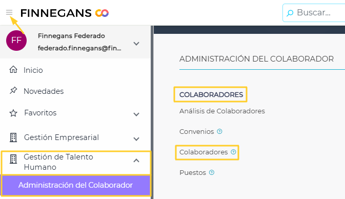 Ingresar al menú > Gestión de Talento Humano > Administración del Colaborador > Colaboradores > Colaboradores.