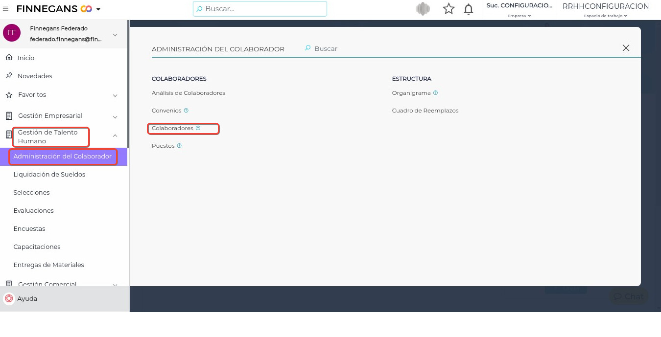 Dirigirse a → Gestión de Talento Humano → Administración del colaborador → Colaboradores.