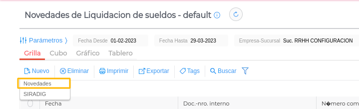 Ingresar al maestro de novedades desde el menú → Gestión de Capital Humano → Liquidación de Sueldos → Novedades → Novedades de Liquidación de Sueldos.