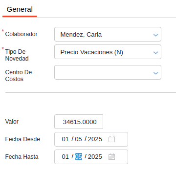 - Solamente se informa el valor día de vacaciones, lo cual el sistema va a tomar como base para realizar luego el pago y descuento