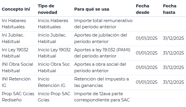 Los conceptos de inicio son códigos especiales que se utilizan para informar valores previos a la liquidación actual. Sirven para arrastrar saldos de liquidaciones anteriores (hechas en otro sistema o manualmente) que son necesarios para cálculos correctos, especialmente del Impuesto a las Ganancias.