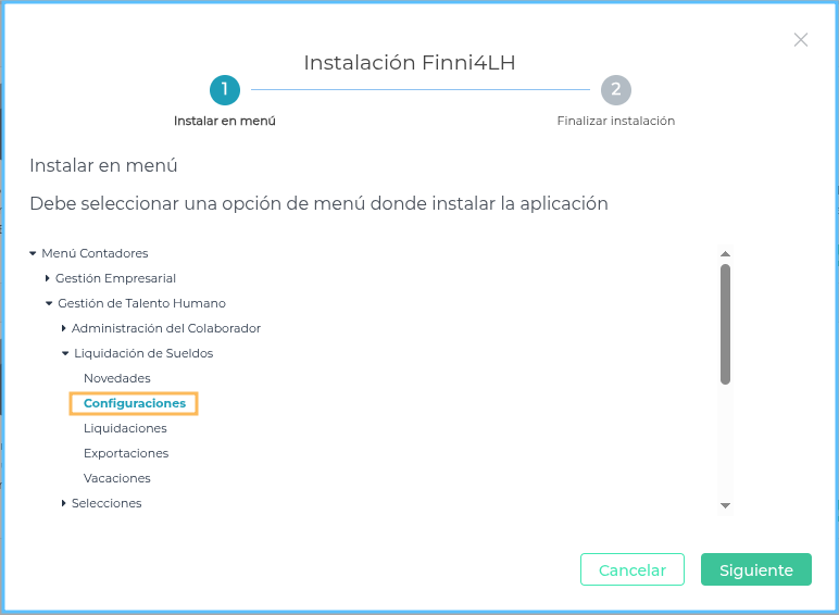 Seleccionar el menú Gestión de Talento Humano → Liquidación de Sueldos → Configuraciones y luego presionar siguiente.