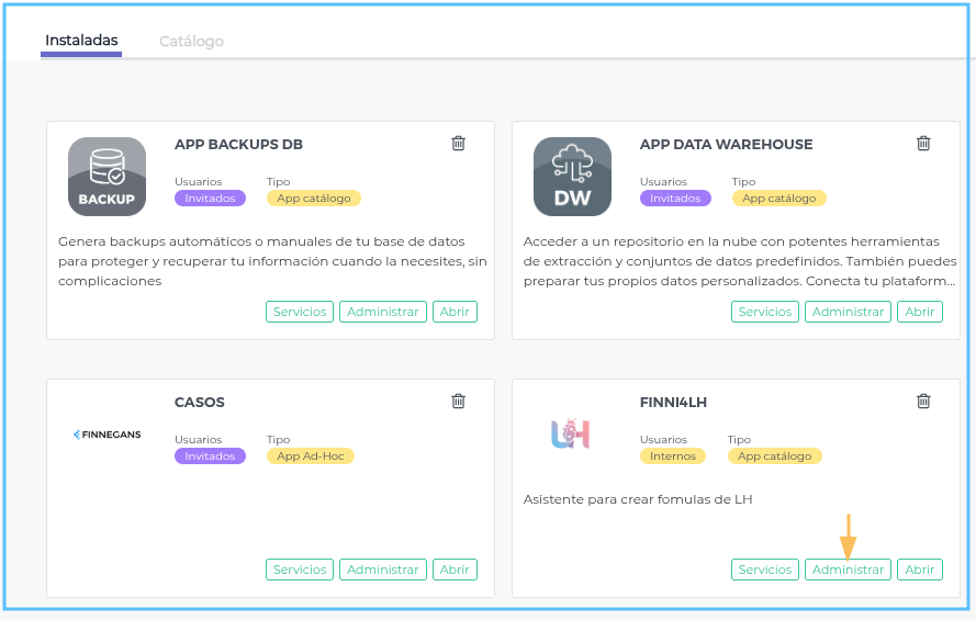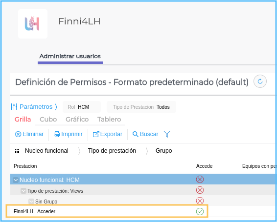 - Una vez instalada, el acceso a Finni4LH se gestiona a través del sistema de Roles y Permisos del espacio de trabajo.