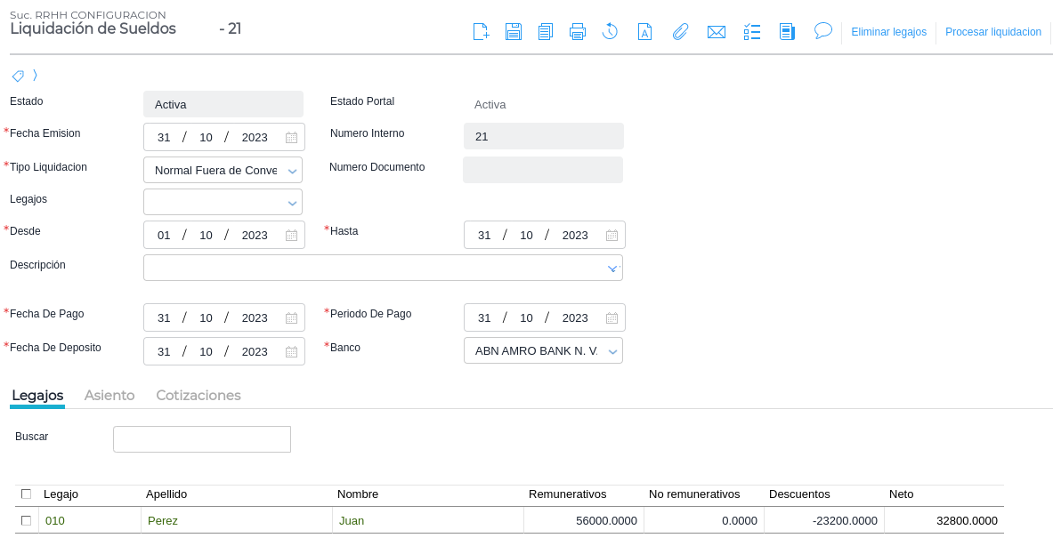 Paso 3: Generar la liquidación normal, agregar al empleado y liquidarlo, en esta liquidación se descontará el anticipo de sueldo: