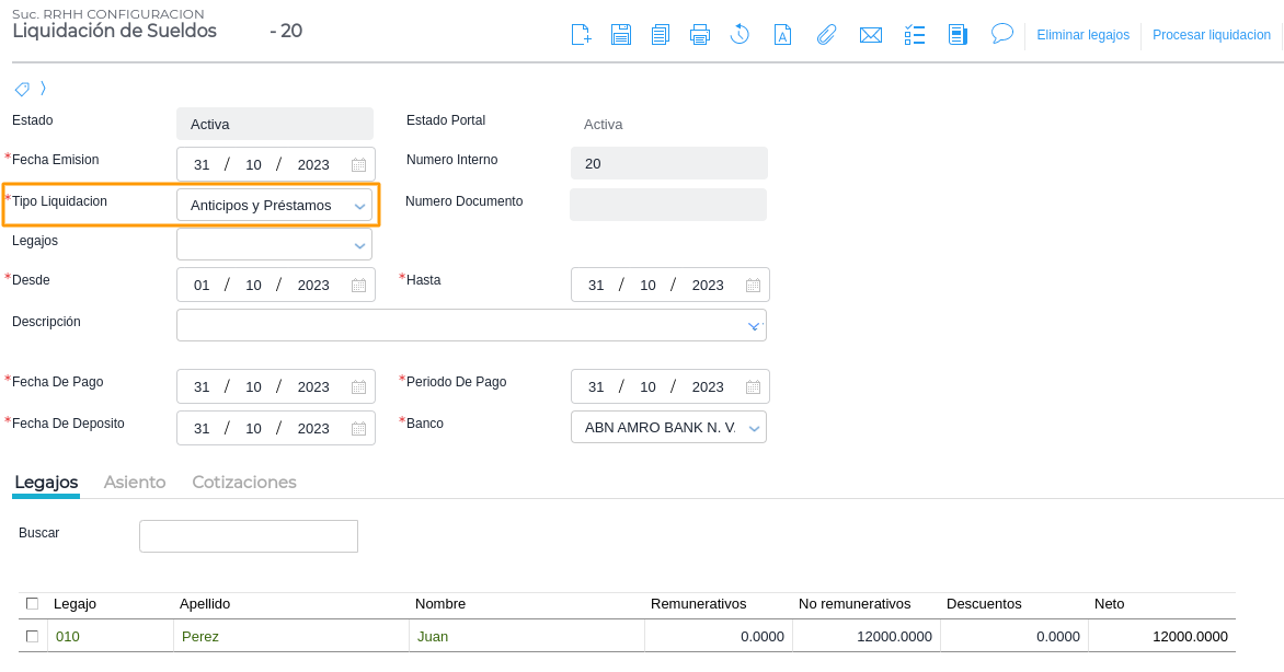 Paso 2: Generar la liquidación de Anticipos y Préstamos, agregar al empleado y liquidarlo: