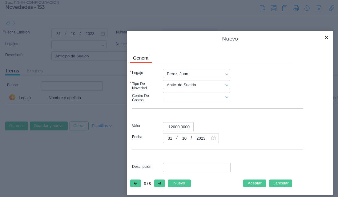Paso 1: Informar el valor del descuento anticipo con la novedad “Desc Anticipo Sueldo NO Liquidado” cuyo código es el “FINN_LCT_7236”: