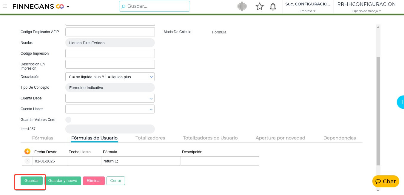 Por defecto el concepto cuenta con el indicativo “Return 0”, para cambiar el mismo se debe → Ingresar la solapa “Fórmulas de usuario” → Hacer clic en el símbolo