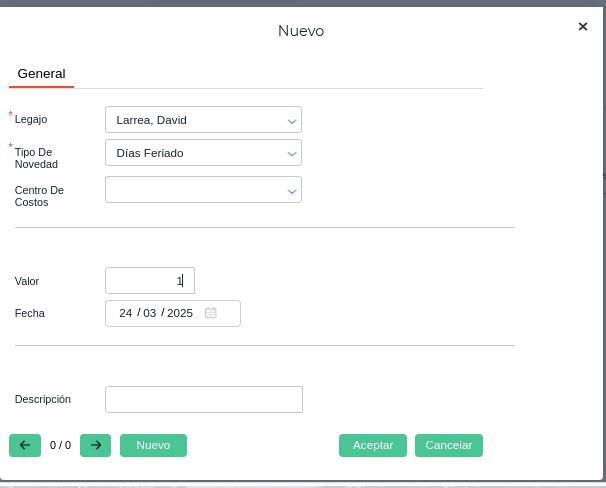 Buscar al colaborador → seleccionar la novedad “FINN_LCT_7040” (Días feriado) → ingresar la cantidad de días/plus feriados a abonar → Aceptar y Guardar la transaccion.