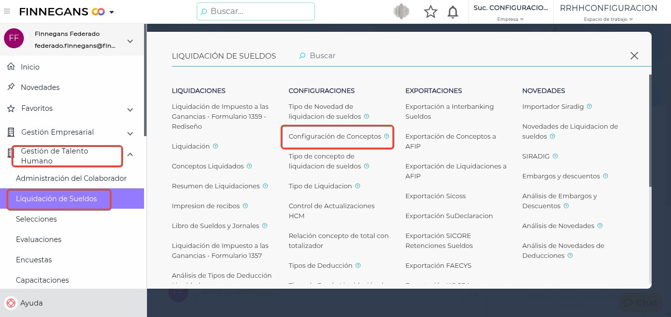 Dirigirse a → Gestión de Talento Humano → Liquidación de sueldos → Configuración de conceptos.