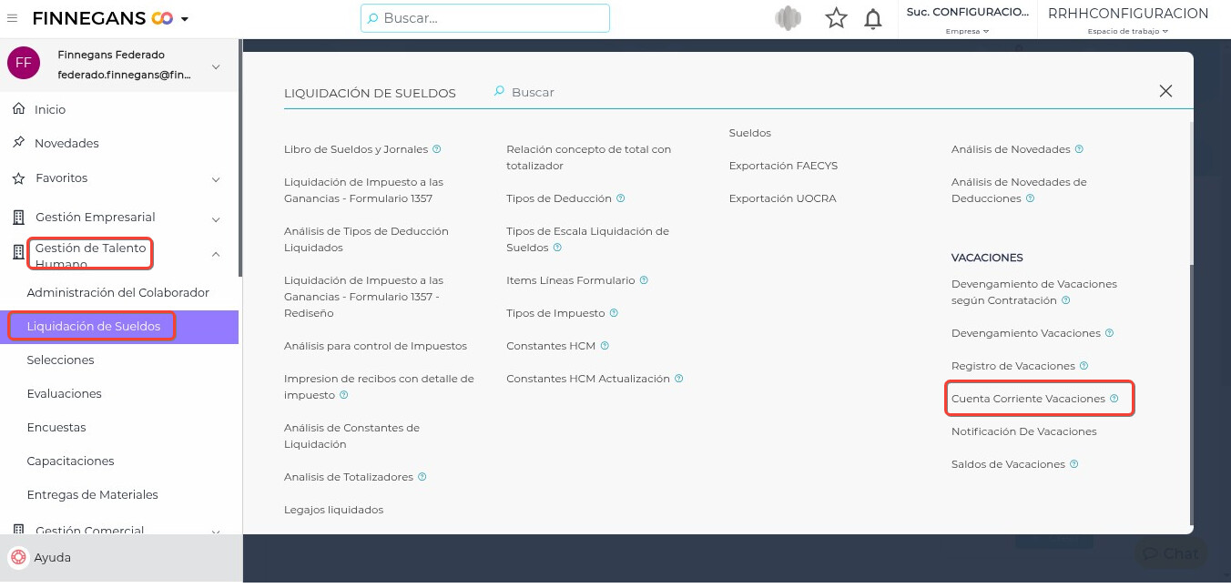 Ingresar a → Gestión de Talento Humano → Liquidación de sueldos → Cuenta corriente de vacaciones.