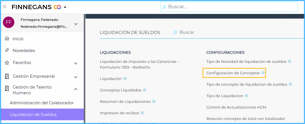 Ingresar al menú → Gestión de Talento Humano → Liquidación de Sueldos → Configuraciones → Configuración de Conceptos.