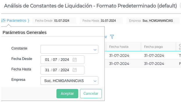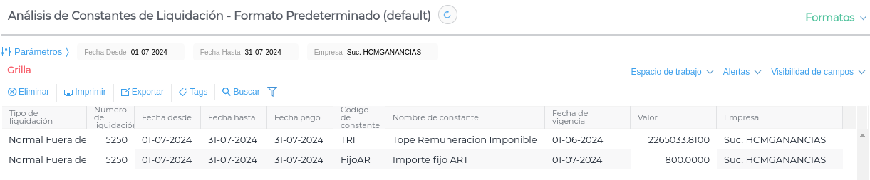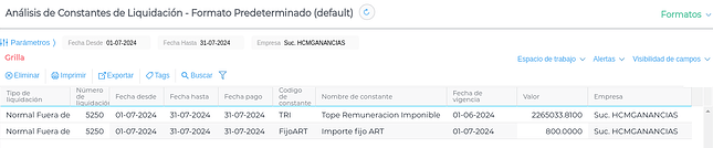 Al finalizar el proceso de liquidación, se guardan los valores de las constantes utilizadas y se podrán ver desde un reporte.