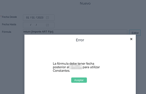 Si utilizara una constante que aún no está vigente, al Aceptar dará el siguiente mensaje