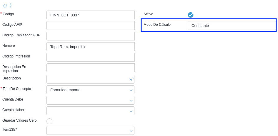 El atributo Modo de Cálculo permite identificar los conceptos de acuerdo a su forma de cálculo por fórmula o constante.