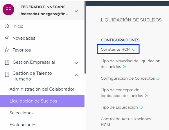 Menú → Gestión de Capital Humano → Liquidación de Sueldos → Configuraciones → Constantes HCM