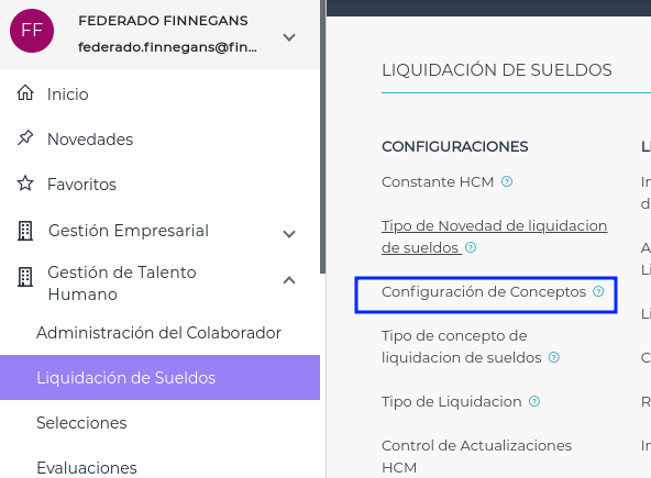 Menú → Gestión de Capital Humano → Liquidación de Sueldos → Configuraciones → Configuración de Conceptos