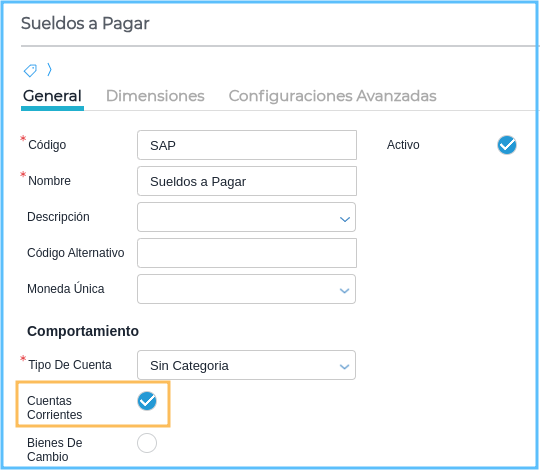 Este error se presenta porque alguna cuenta involucrada en el asiento de sueldos tiene tildado el campo Cuentas Corrientes.