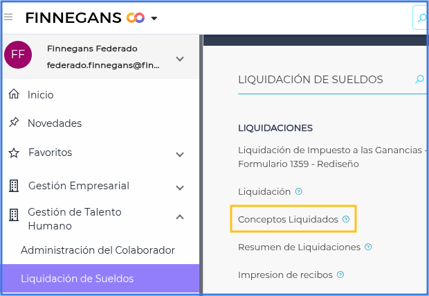 Ingresar al menú → Gestión de Talento Humano → Liquidación de Sueldos → Conceptos Liquidados.
